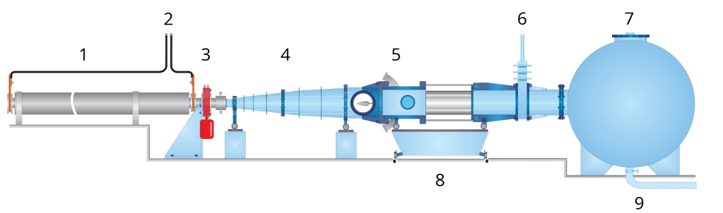 1: Akkumulatorrør, 2: Elvarme, 3: Hurtigtvirkende skydeventil, 4: Dyse, 5: Måleområde 6: Vakuumskydeventil, 7: Vakuum beholder, 8: Bevægelig modelholder, 9: rørføring til vakuumpumpe. Konstruktion af Ludwieg-rørets vindtunnel, Göttingen. Kilde: DLR.